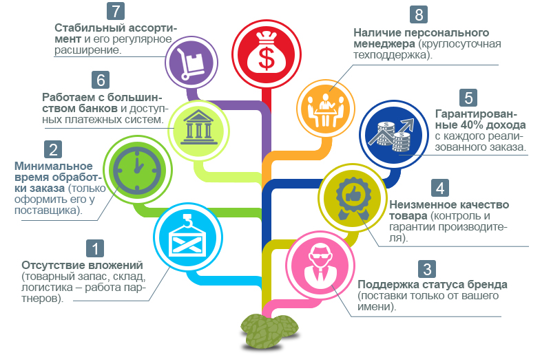- минимальные вложения или вообще их отсутствие (логистические решения от партнера);